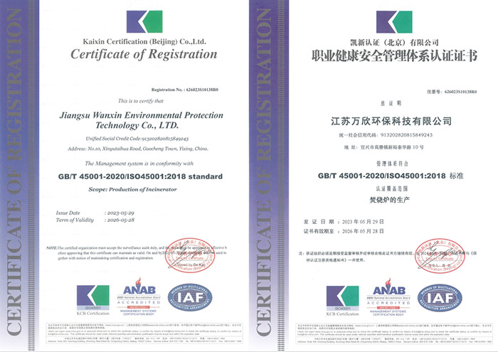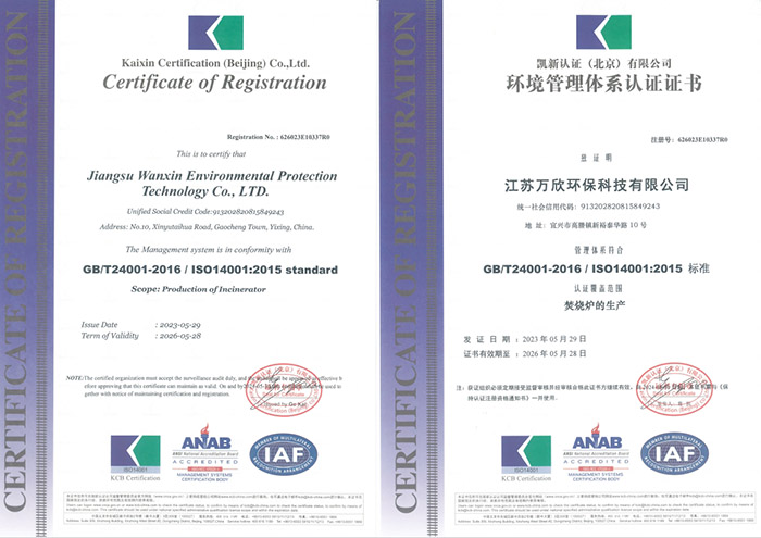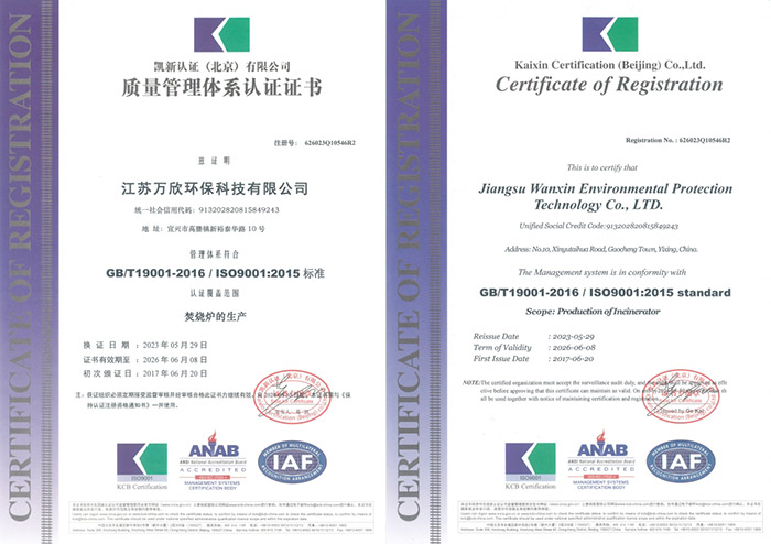 We have incinerator production, licensing, and environmental management system certification certificates GB/T24001-2016/ISO14001:2015; occupational health and safety management system GB/T45001-2020/ISO45001:2018; quality management system production GB/T19001-2016/ISO9001: 2015, possesses 22 patents and other qualification.